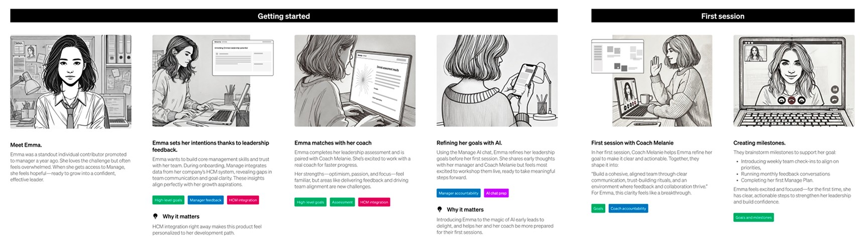 At this stage, I experimented with generative AI to craft these storyboards, following our core personas as they engaged with BetterUp.