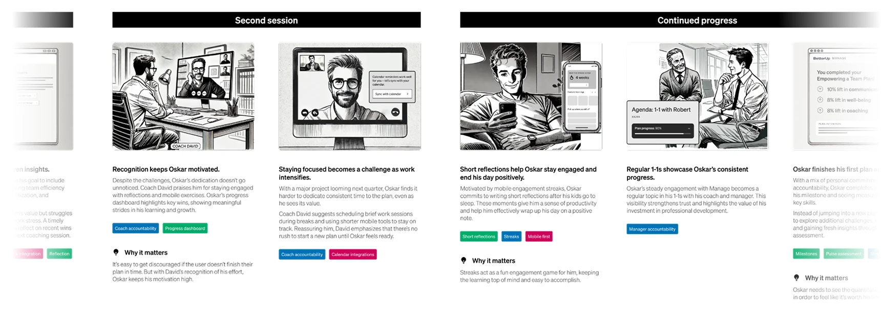 To create clarity for the team, I developed Manage Personas & Storyboards — visual frameworks that showed how different types of managers might engage over a year in Manage.