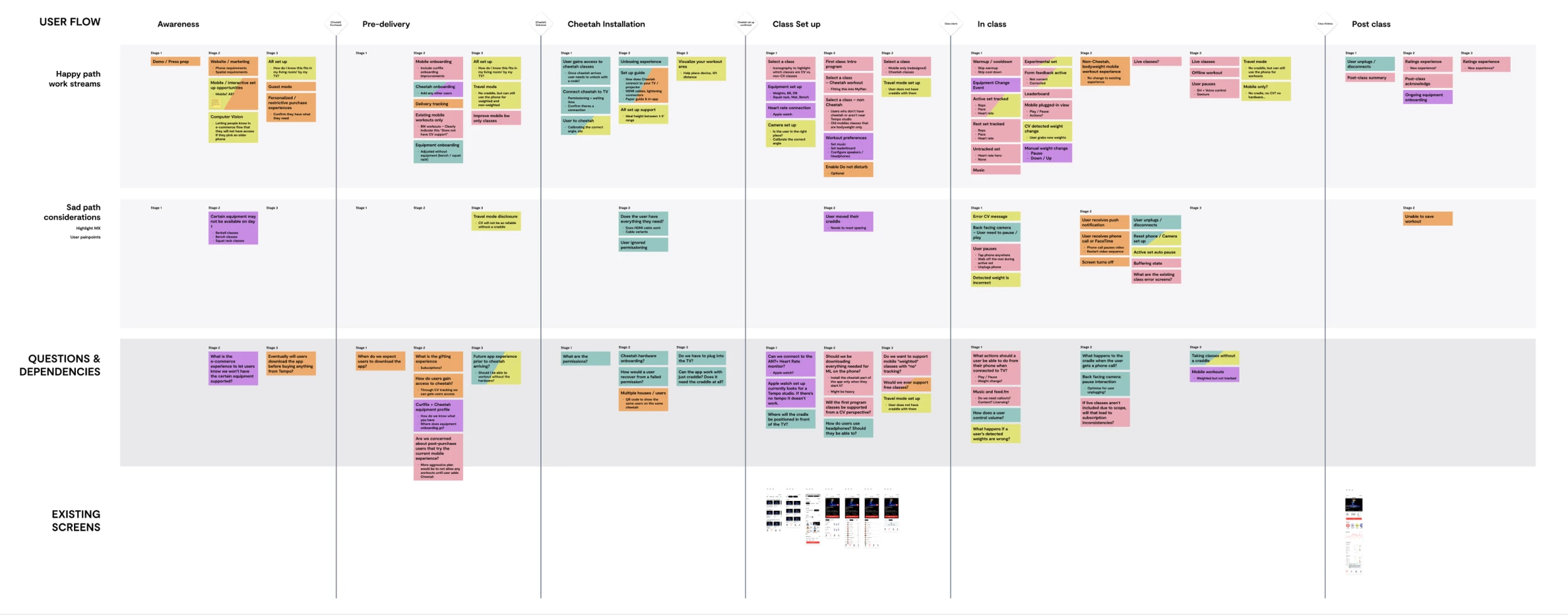 As I created a user journey of the phases across activation, delivery, installation, set up, and the class experience, I called out the happy path, sad path and any key questions to bring to the group.